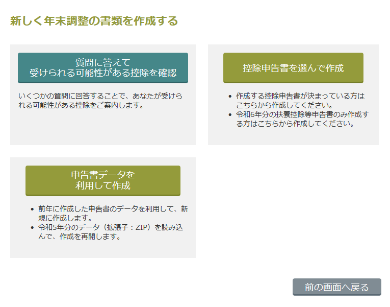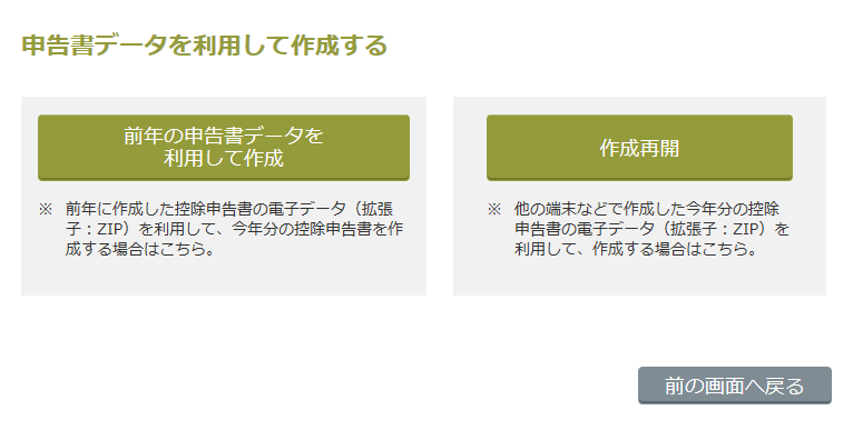 前年に作成した控除申告書データがある場合は、[申告書データを利用して作成]ボタンをクリックして、「前年の申告書データを読み込む」に進んでください。