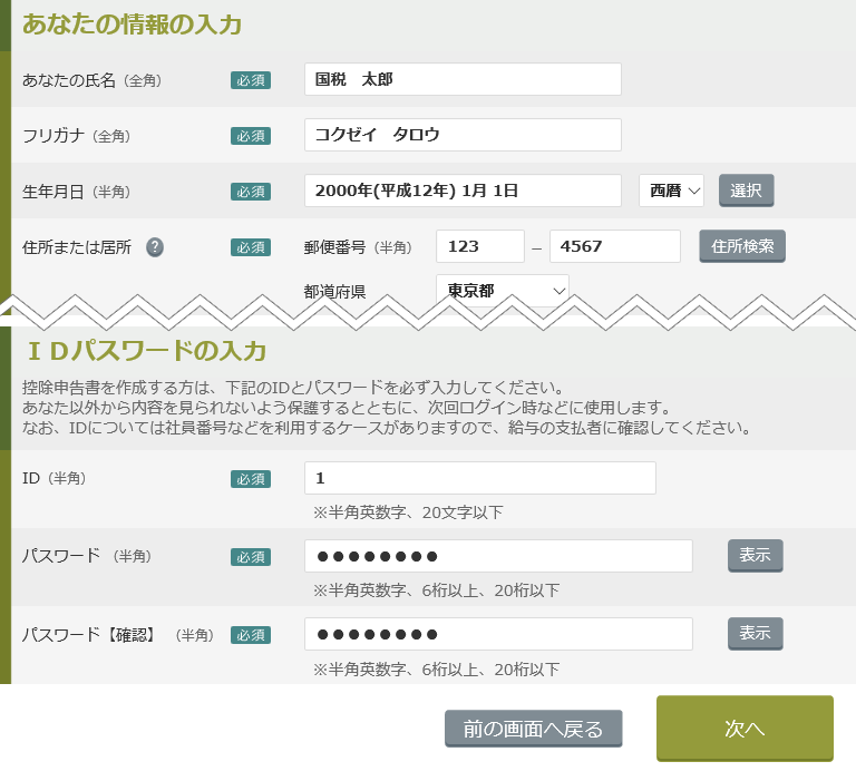 一致していない場合は、[戻る]ボタンをクリックして、基本情報の入力画面で修正してください。