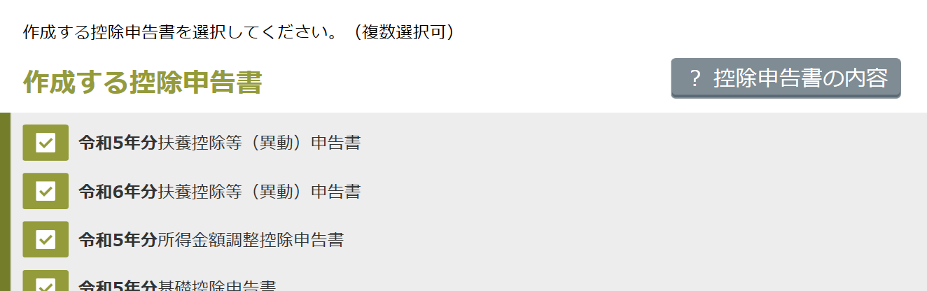 作成する控除申告書が決まっている場合は、[控除申告書を選んで作成]ボタンをクリックして、基本情報の入力画面に進んでください。