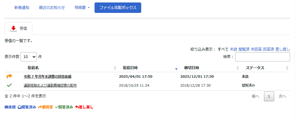 受信の一覧が表示されるので、年末調整の配信名をクリックします。