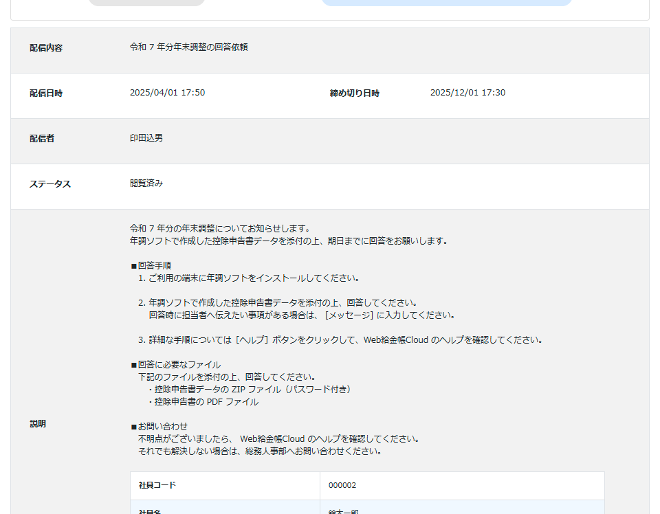 Web給金帳Cloud のファイル宅配ボックス機能を利用して、会社の年末調整担当者が作成した、年末調整に必要なデータを受け取ります。