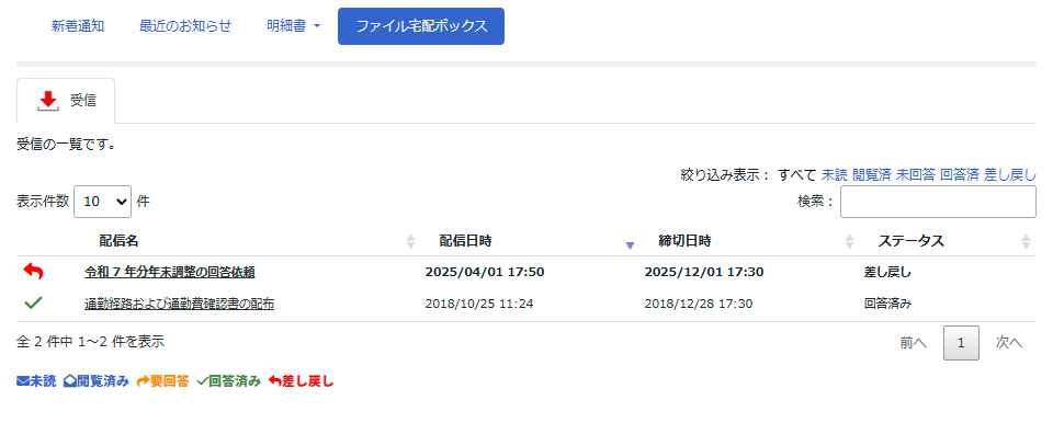 ファイル宅配ボックスの[受信]タブで、[ステータス]が「差し戻し」になっている配信をクリックします。