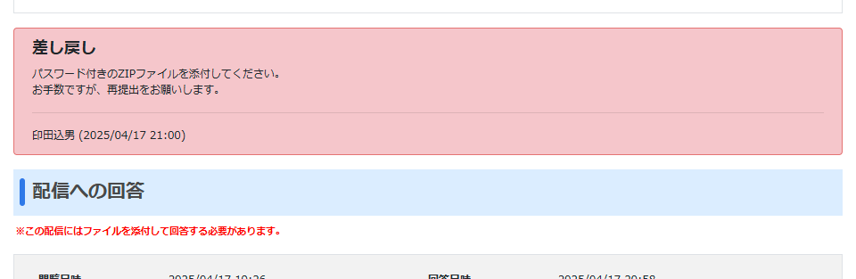 差し戻された場合は、メッセージを確認して必要な対応を行ってから、年末調整配信に再び回答します。