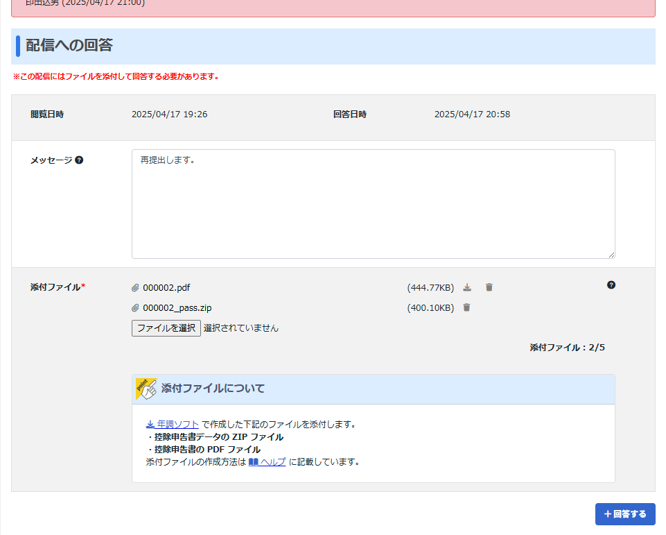 控除申告書データの ZIP ファイルは、パスワード付きまたはパスワードなしのどちらかを添付してください。