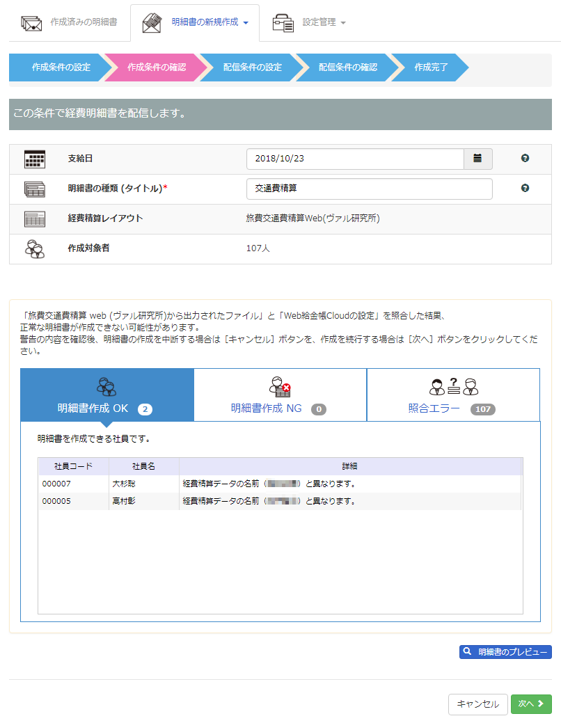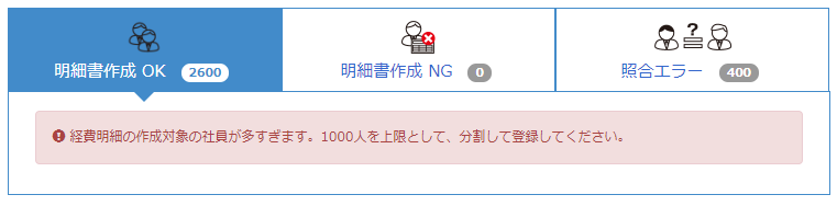 経費明細の作成対象人数の制限について[作成対象者]の人数が 1001 人以上の場合は、エラーメッセージが表示され、明細を作成できません。 [作成条件の設定]画面で、[作成対象者]の人数を 1000 人以下に変更して、経費明細を作成してください。
