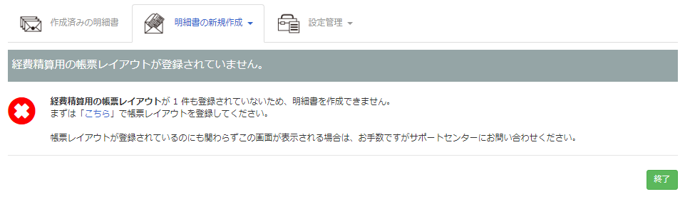 経費明細用の帳票レイアウトを取り込みしていない場合は、次の画面が表示されるので、「こちら」のリンクをクリックして、帳票レイアウトを取り込みます。