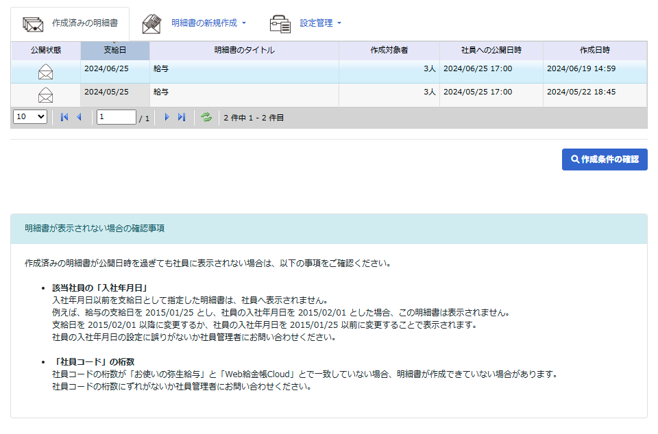 社員の明細書を閲覧します。作成済みの明細書を閲覧するには、[設定]メニューの[給与設定]タブで、閲覧用のパスワードを設定する必要があります。