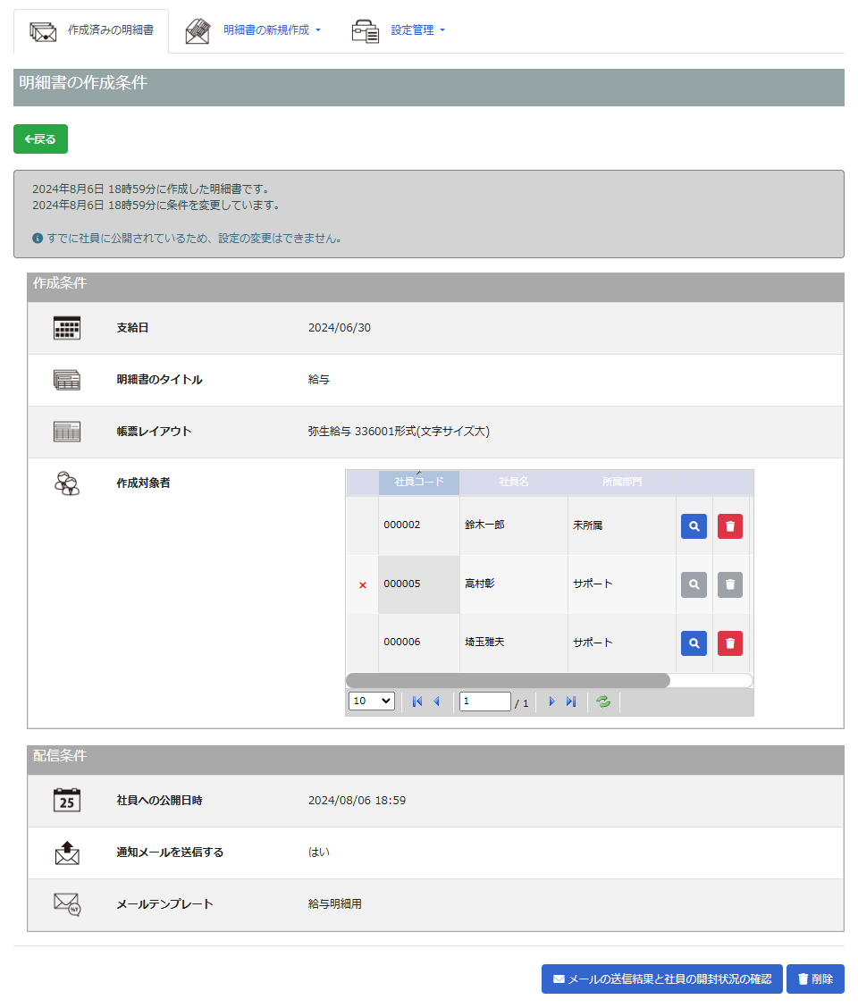 社員への公開日時より前に削除した場合、明細書公開の通知メールは、対象の社員には送信されません。