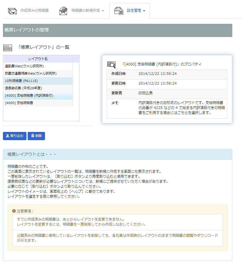 [レイアウト名]のレイアウトの一覧から取り込むレイアウト名にチェックを付けて、[登録]ボタンをクリックします。
