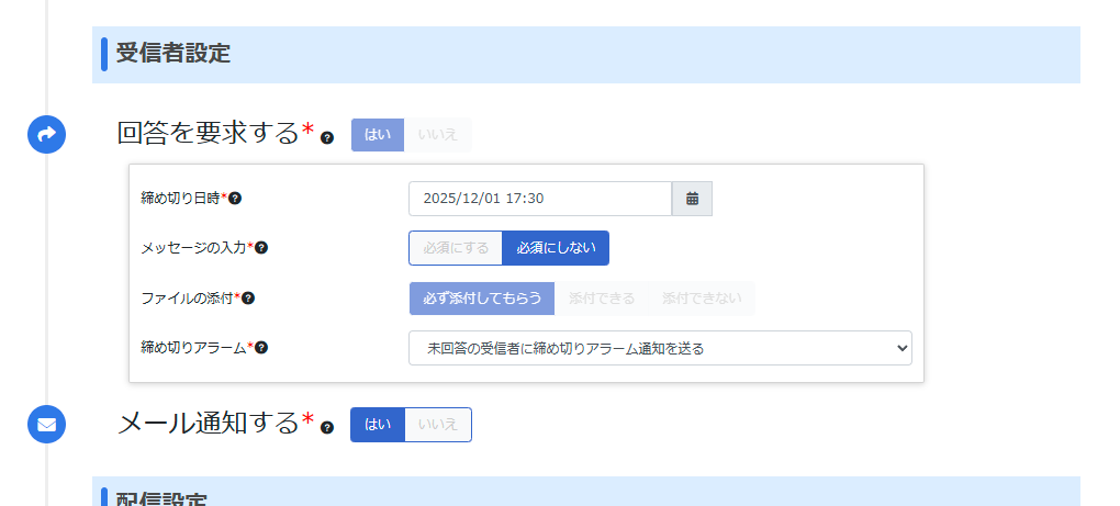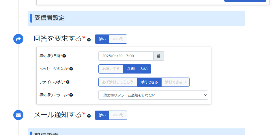 受信者に回答を要求します。締め切り日時などの指定が必要です。