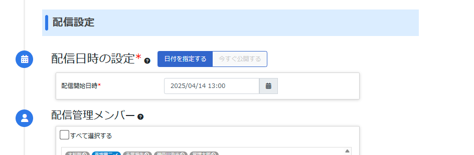 配信名を入力します。配信名は、[配信]タブの配信名の一覧や、配信時に送信されるメールの件名などに表示されます。