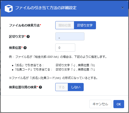 ファイルの引き当て方法の詳細設定を行います。社員の氏名または社員コードを、ファイル名のどの位置から検索するかを設定できます。