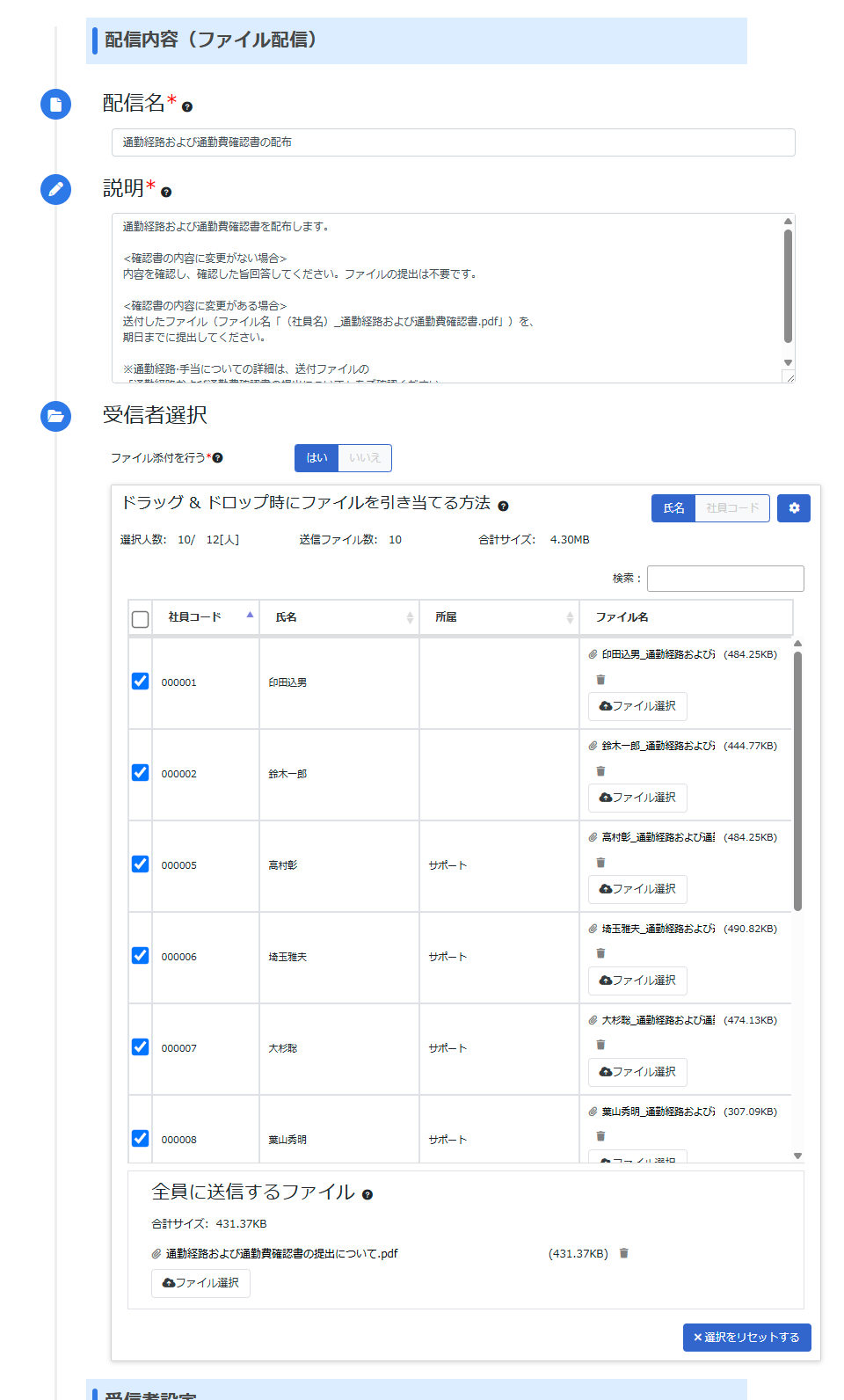社員ごとに送信するファイルを選択します。ファイルの数が多い場合は、ドラッグ & ドロップで引き当てると、手間が省けて便利です。