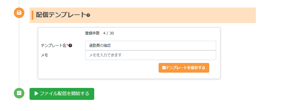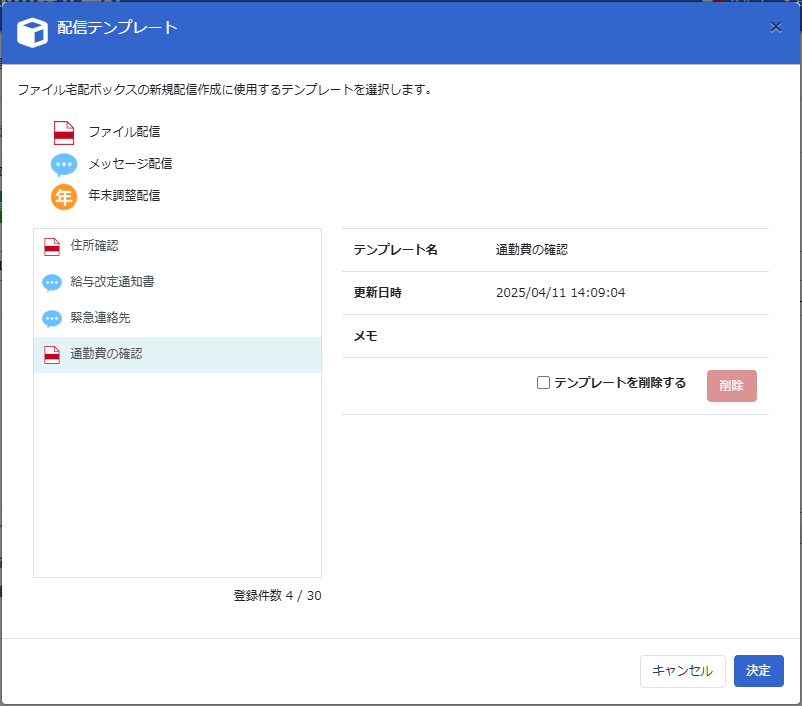 ファイル宅配ボックスの配信時に「テンプレートを保存する」を行うと、[テンプレートを使用して配信する]メニューから保存したテンプレートを読み込むことができます。