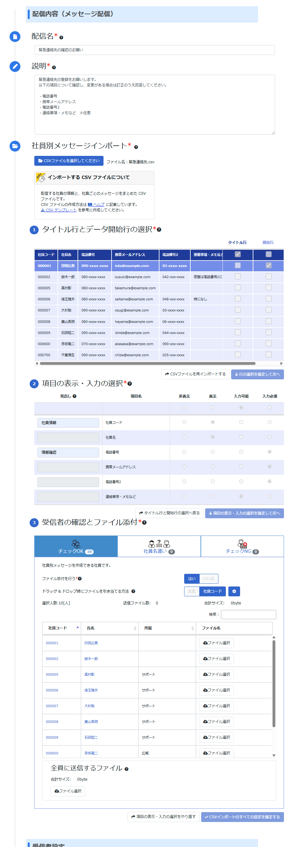 CSV 形式のファイルに設定した情報をもとに、社員一人ひとりに、配付するメッセージを個別に設定できます。 また、配付した情報を書き込みできるようにして、変更内容を受け取ることもできます。