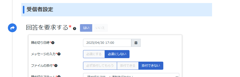 受信者の回答時に、ファイルの添付を必須にするか選択します。
