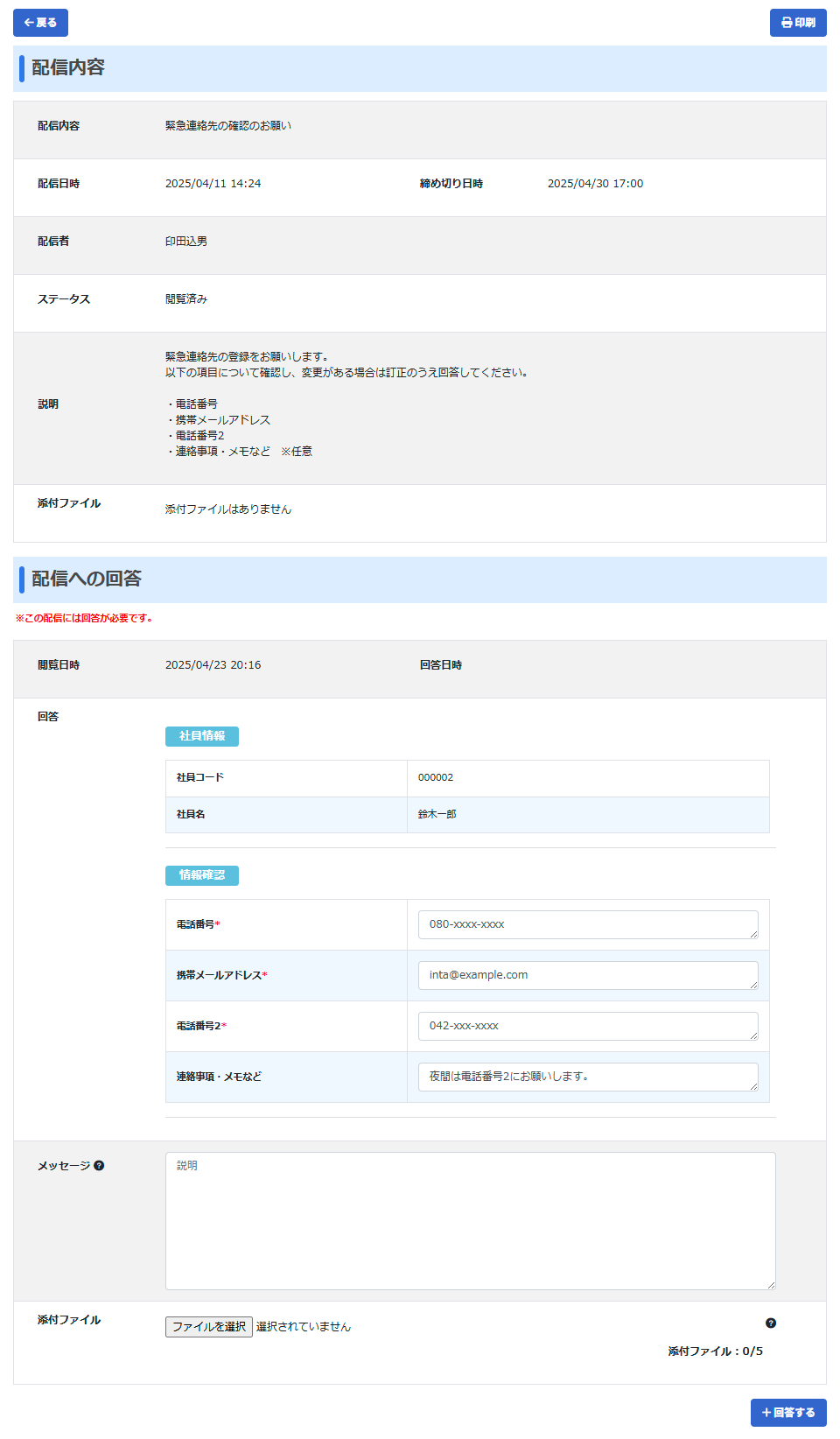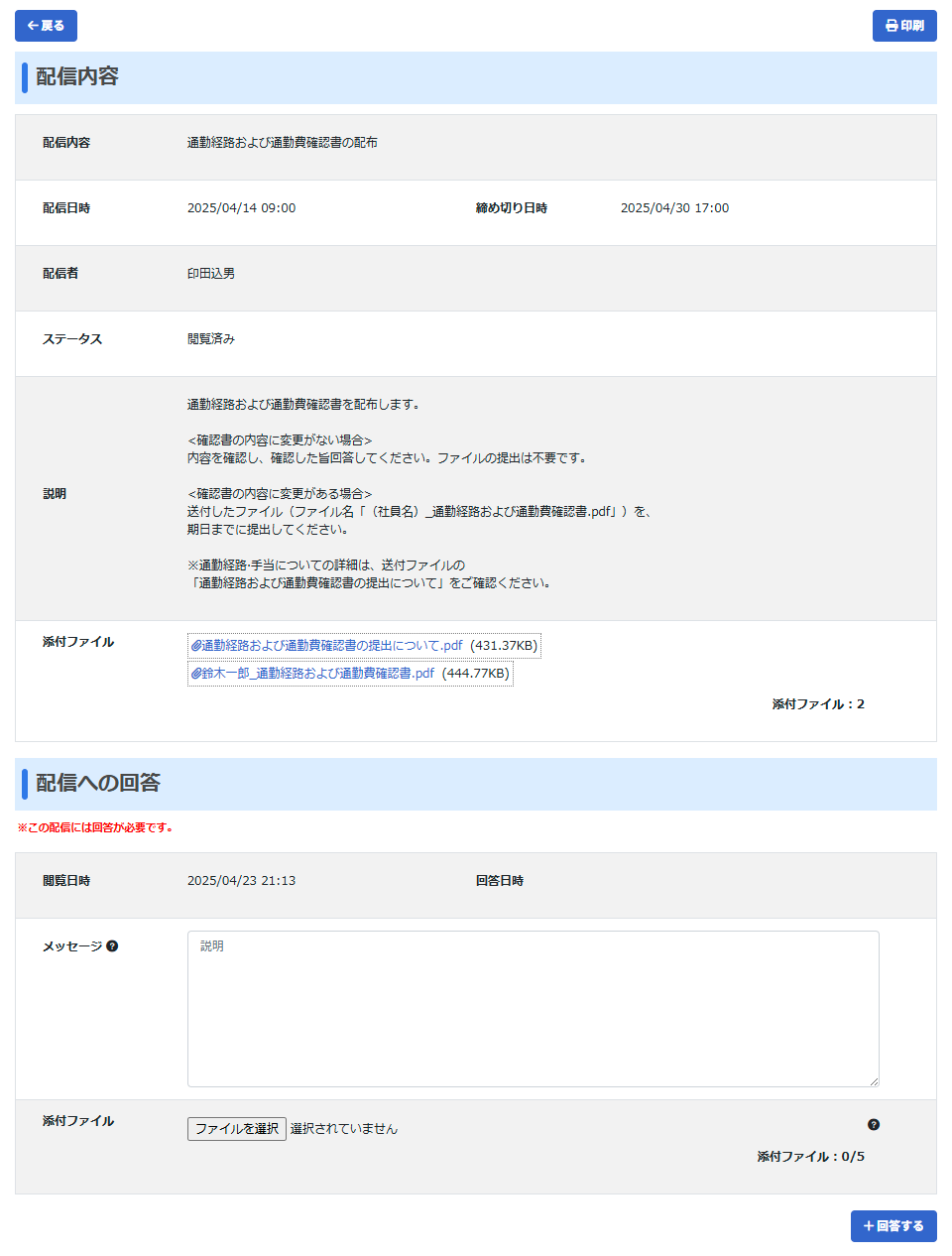メッセージ配信で、回答の入力が必要ない場合は、ここに社員別メッセージの内容が表⽰されます。 - 添付ファイル