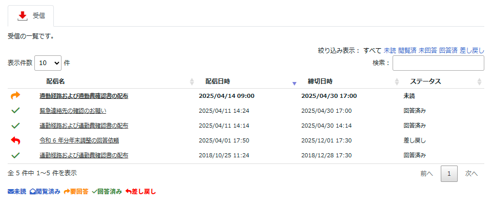 回答が必要な配信に未回答の場合も含みます。回答済み 配信に回答済みの状態です。 差し戻し 配信に回答後、配信担当者から差し戻された状態です。