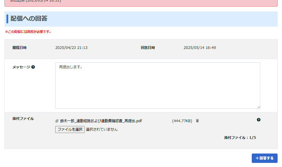 - 回答が必須の場合は、「※この配信には回答が必要です。」と表示されます。回答が必須でない場合も、必要に応じて回答やファイルを提出できます。