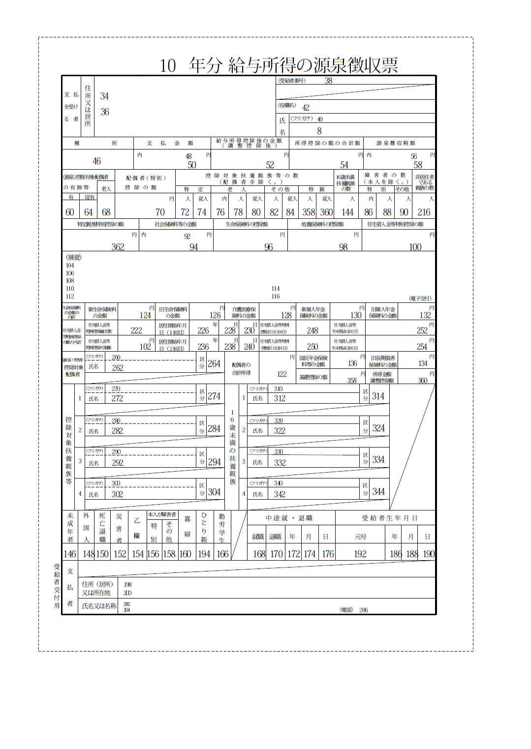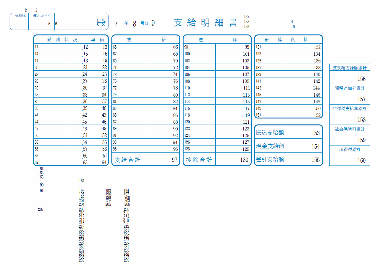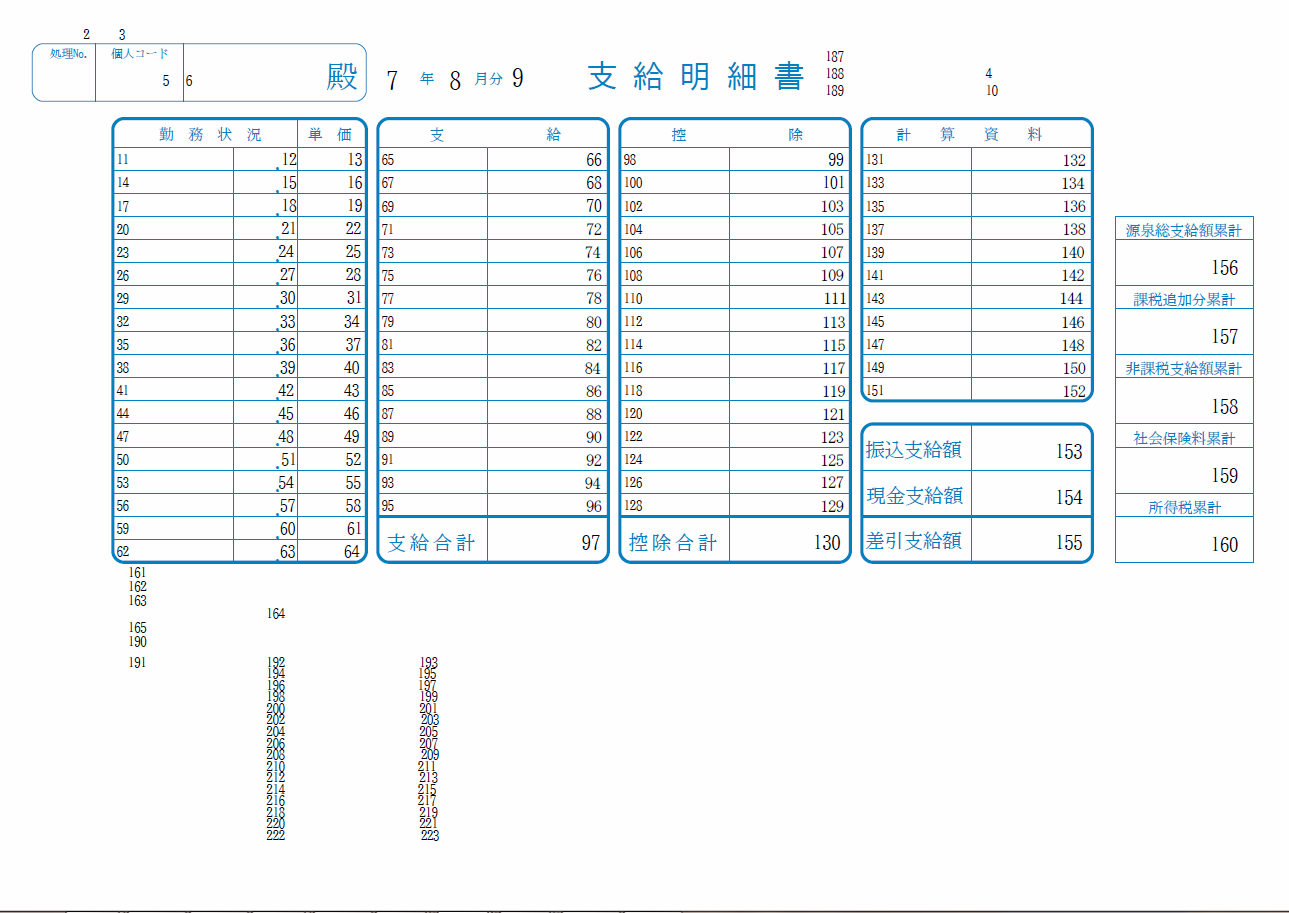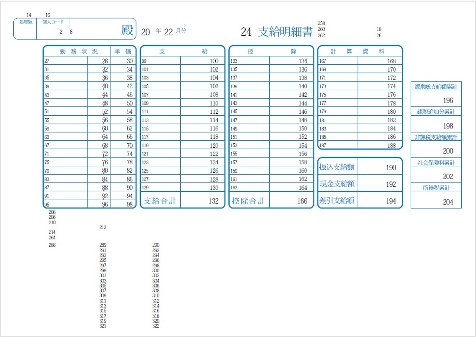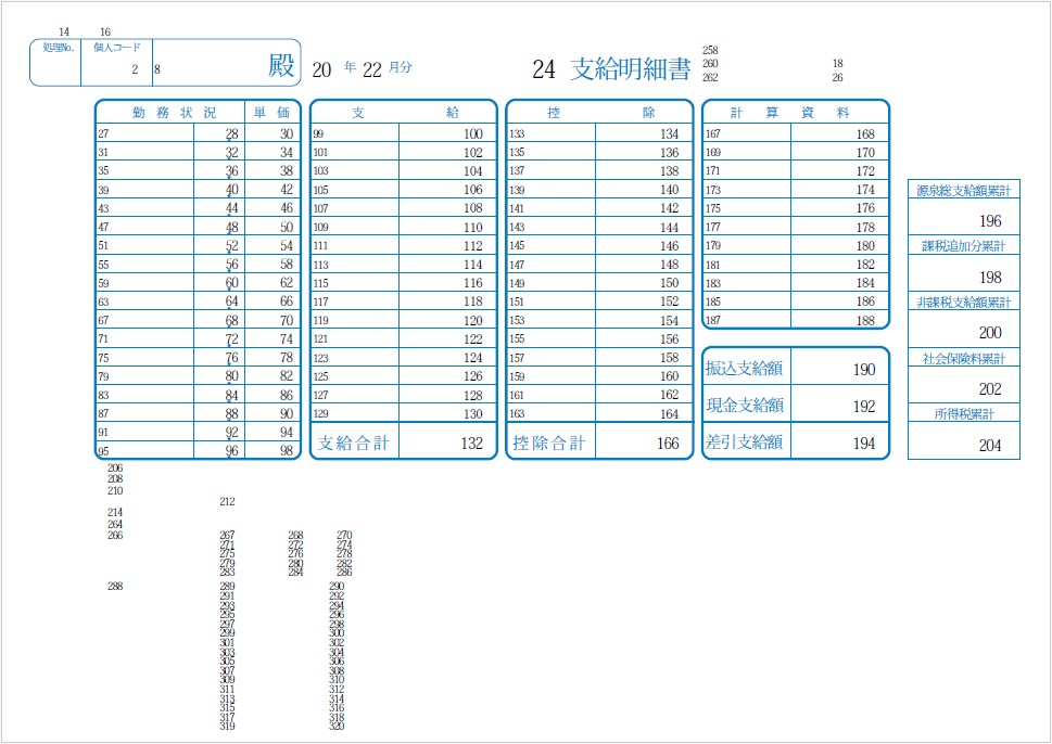 ARDIO の帳票のレイアウト 明細の数字は、フィールド番号です。明細に表示されている数字以外の文字は、固定出力される項目です。 目次 帳票名:給与明細書帳票名:賞与明細書帳票名:源泉徴収票帳票名:社員情報確認用ダミー明細書 帳票名:給与明細書 帳票名:賞与明細書 帳票名:源泉徴収票 帳票名:社員情報確認用ダミー明細書