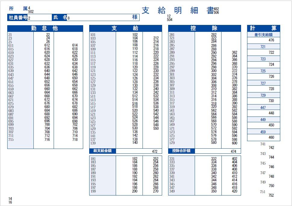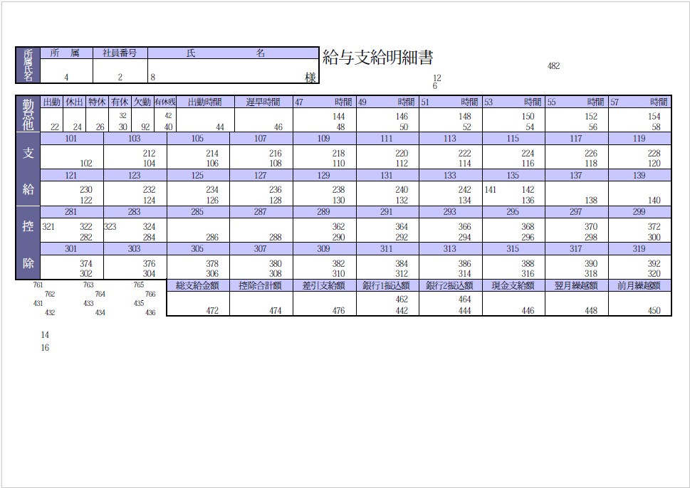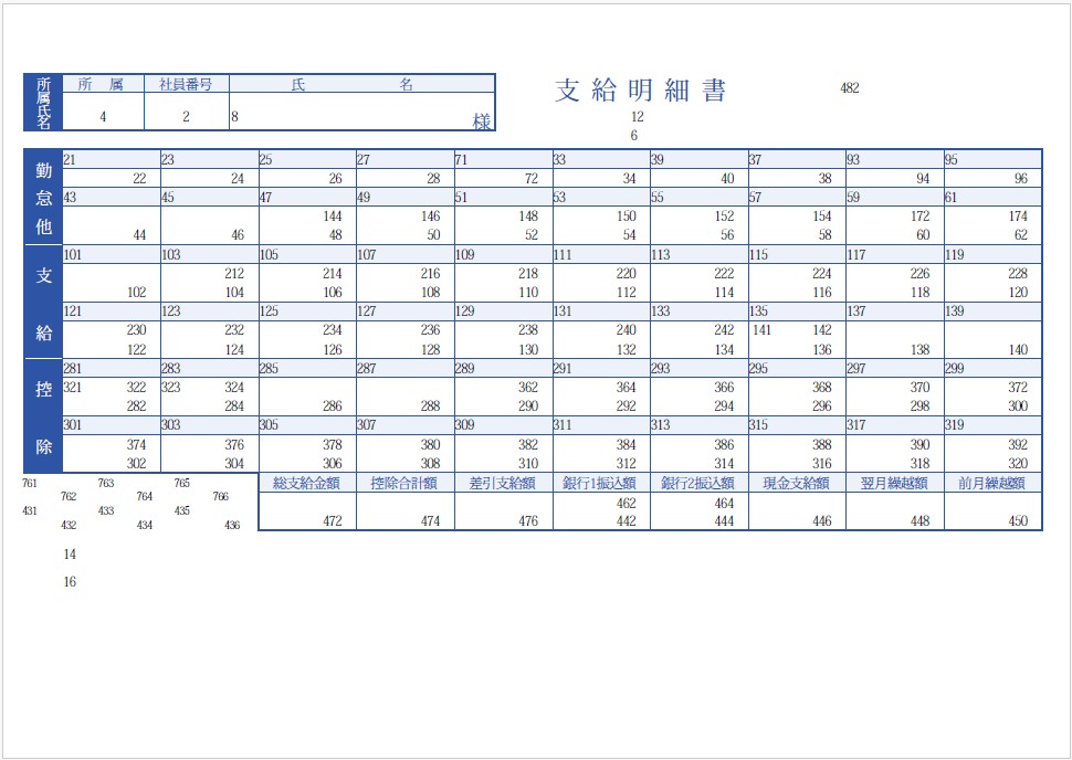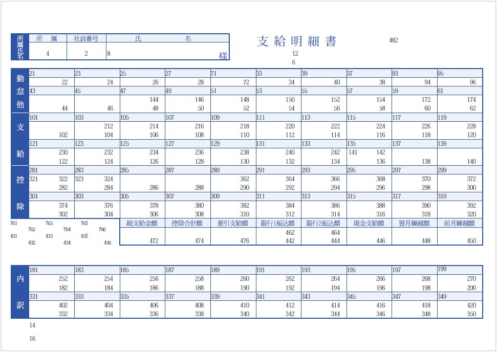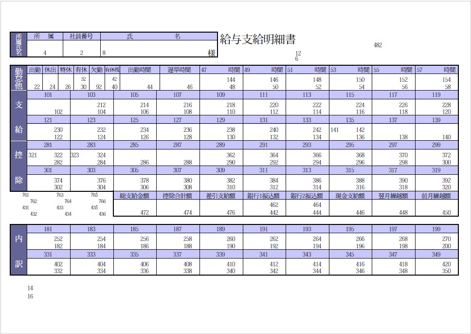 給与奉行の帳票のレイアウト 明細内の数字は、フィールド番号です。明細内に表示されている数字以外の文字は、固定出力される項目です。 目次 帳票名:[4000]支給明細書帳票名:[4000]支給明細書(内訳項目付)帳票名:[6000]支給明細書帳票名:[6000]支給明細書(内訳項目付)帳票名:[拡張項目]支給明細書(内訳項目付)帳票名:源泉徴収票帳票名:社員情報確認用ダミー明細書 帳票名:[4000]支給明細書 帳票名:[4000]支給明細書(内訳項目付) 帳票名:[6000]支給明細書 帳票名:[6000]支給明細書(内訳項目付) 帳票名:[拡張項目]支給明細書(内訳項目付) 帳票名:源泉徴収票 帳票名:社員情報確認用ダミー明細書