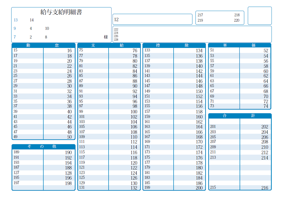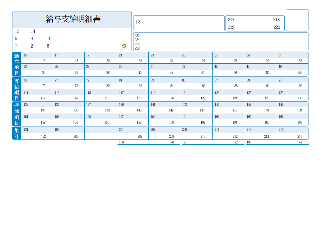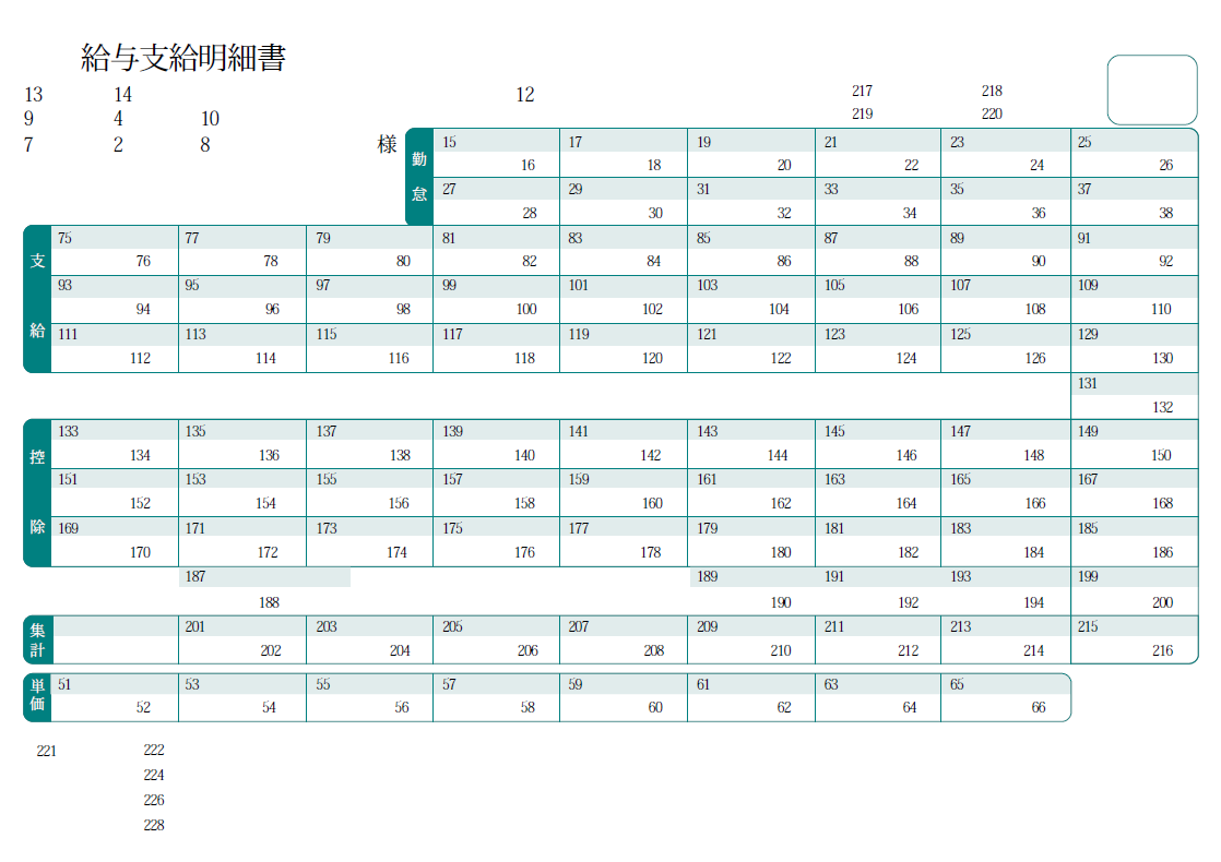 エプソンの給与計算の帳票のレイアウト 明細内の数字は、フィールド番号です。明細内に表示されている数字以外の文字は、固定出力される項目です。 目次 帳票名:支給明細書 (A4 2分割)帳票名:支給明細書 (A4 3分割)帳票名:支給明細書 (B5)帳票名:社員情報確認用ダミー明細書 帳票名:支給明細書 (A4 2分割) 帳票名:支給明細書 (A4 3分割) 帳票名:支給明細書 (B5) 帳票名:社員情報確認用ダミー明細書