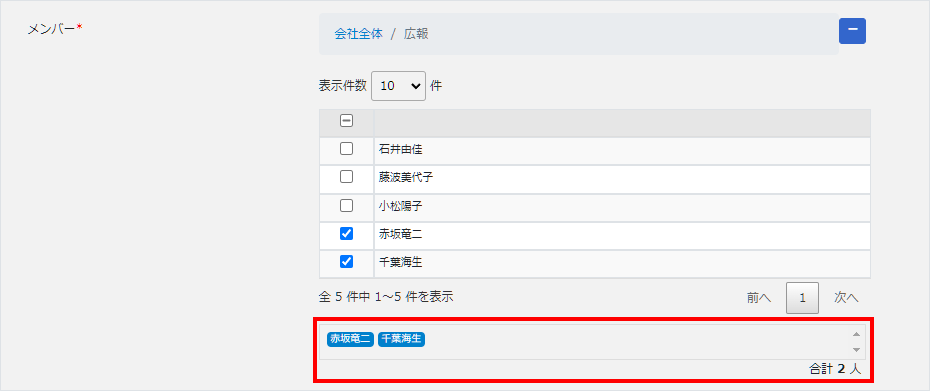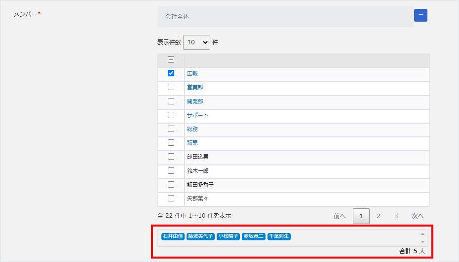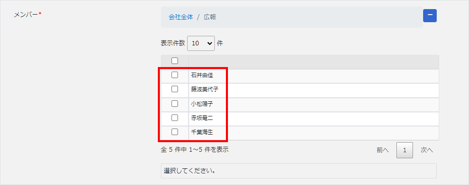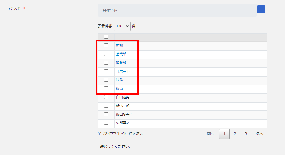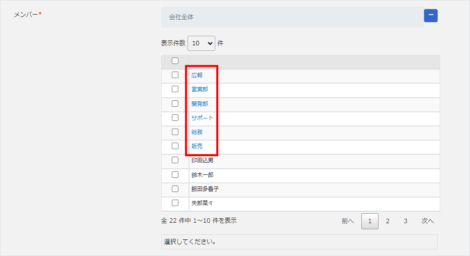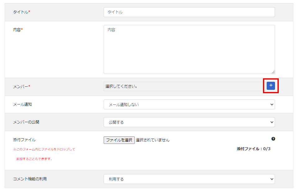 [お知らせの新規登録]画面の[メンバー]の[+]ボタンをクリックします。