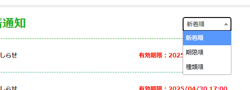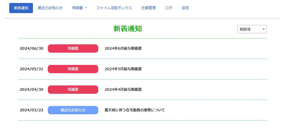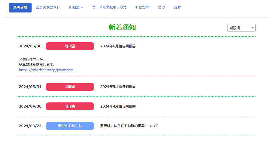新着通知を確認する ここでは、新着通知の内容を確認する方法について説明します。 STEPメニューから、[新着通知]をクリックします。 STEP新着通知の一覧が表示されます。内容を確認したい通知のタイトルをクリックします。 通知の並び替え 右上のメニューから、通知の並び替えができます。 STEP通知内容が表示されます。内容を確認します。 URLをクリックすると、さらに詳しい内容が表示されます。