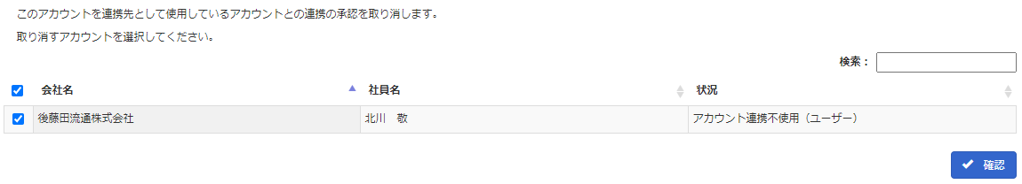 連携の承認を取り消すアカウントにチェックを付け、[確認]ボタンをクリックします。