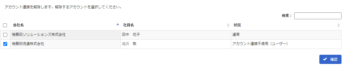 連携を解除するアカウントにチェックを付け、[確認]ボタンをクリックします。