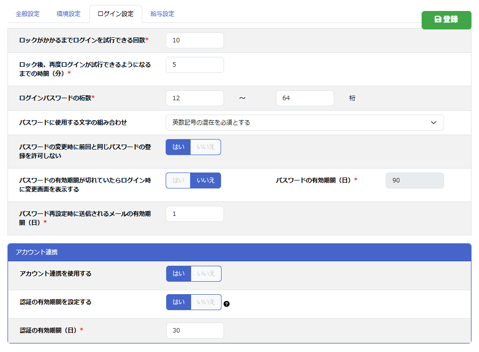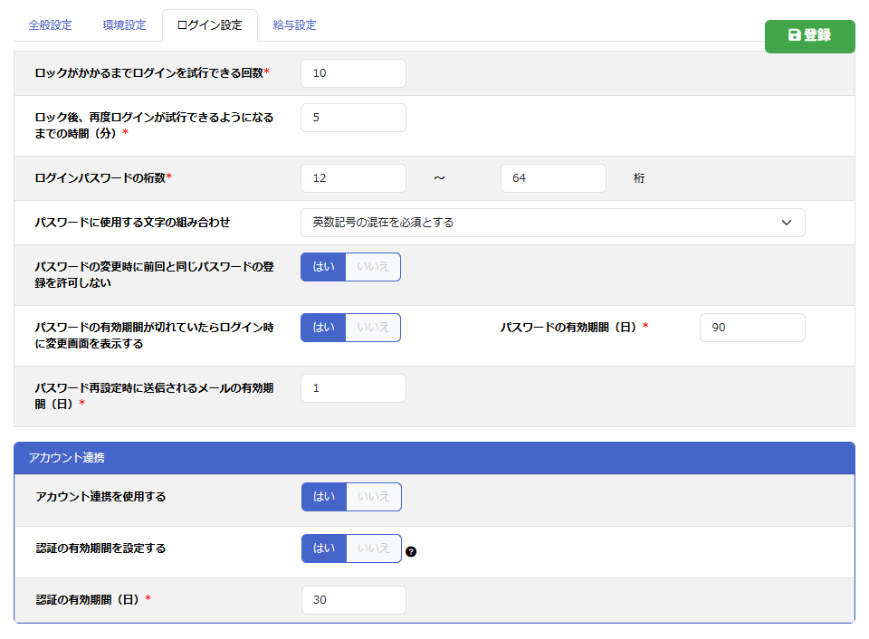 - [パスワードの有効期間が切れていたらログイン時に変更画面を表示する]:[いいえ]