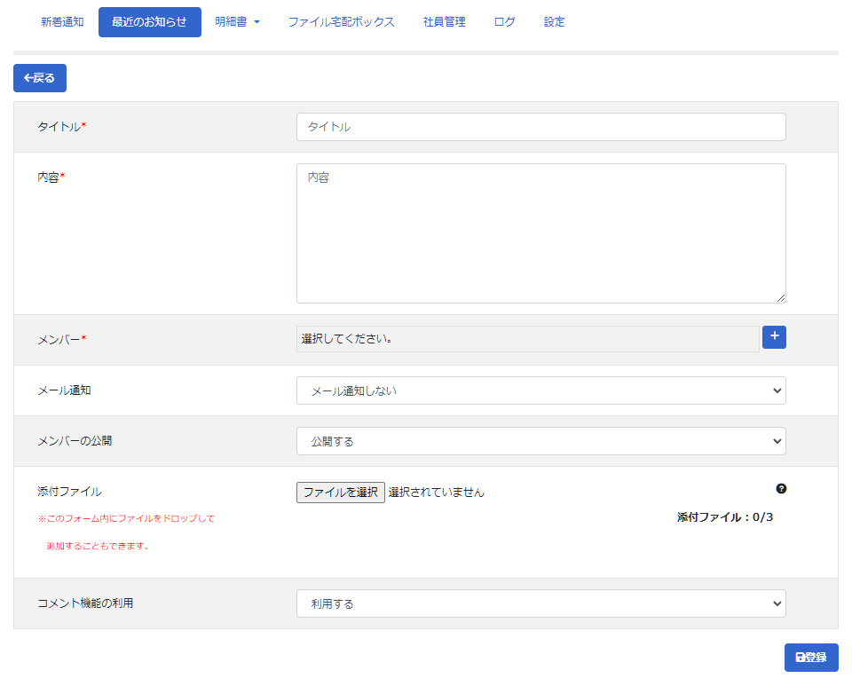 [登録]ボタンをクリックすると、[お知らせの登録]ダイアログが表示されます。