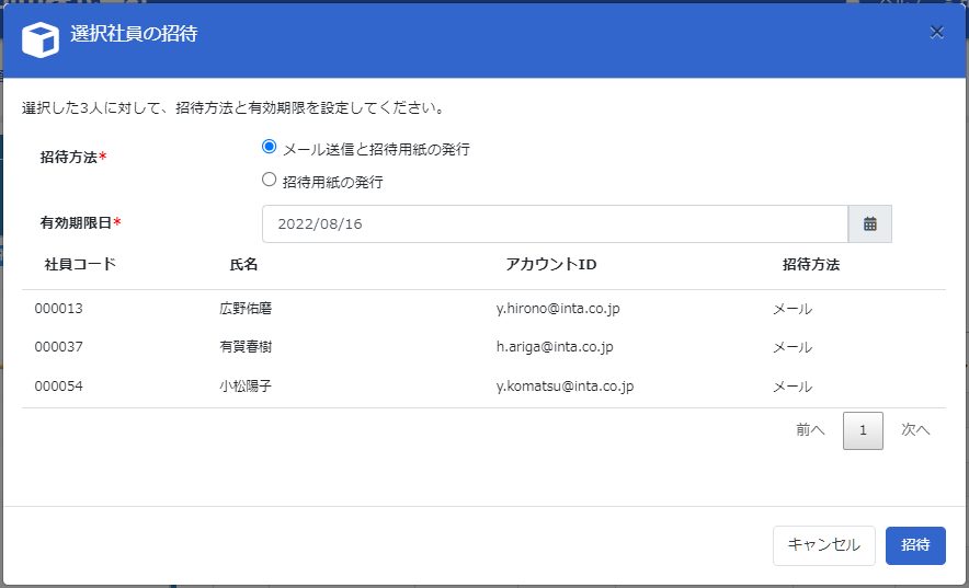 社員を招待するには、招待メールを送信する方法と、招待用紙を紙に印刷して渡す方法があります。