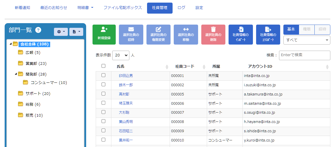社員の登録、社員の招待(サービス利用開始前の URL 送信)、社員と部門情報の編集などをします。