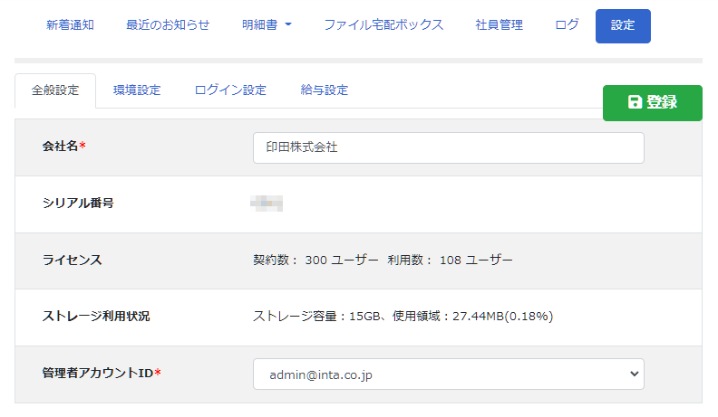 会社名やシリアル番号、ライセンス数などの設定は、ご契約内容を基に登録しています。