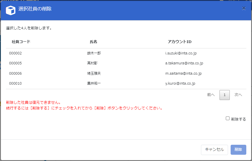 削除した社員は、復元できません。誤って削除しないよう注意してください。