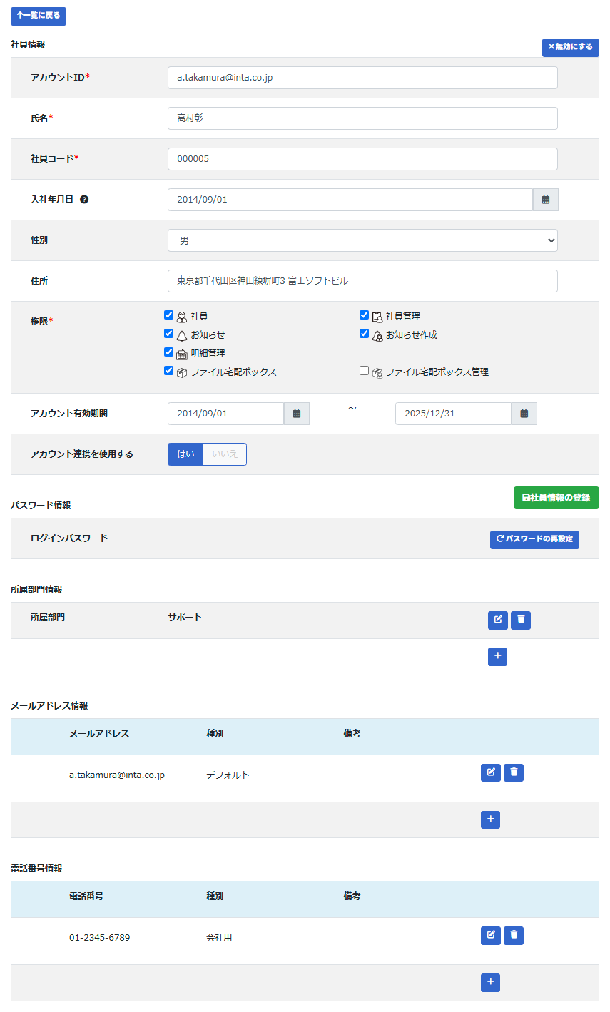 社員の詳しい情報を入力します。変更した場合、[社員情報の登録]ボタンをクリックすると反映されます。