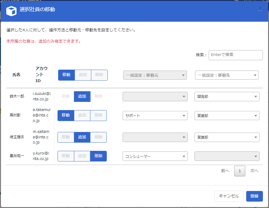 社員の一覧が表示されるので、社員ごとに所属の変更方法と移動元の部門(左側)、移動先の部門(右側)を設定します。